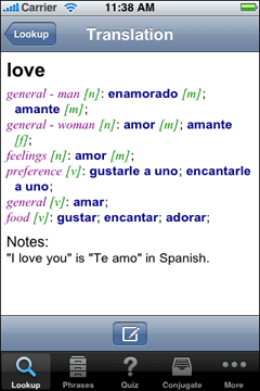 - Quick lookups. Each keystroke reduces the list to matching entries then scroll and tap on word to display translation definition.